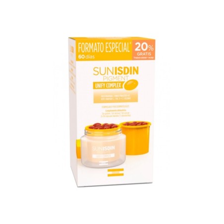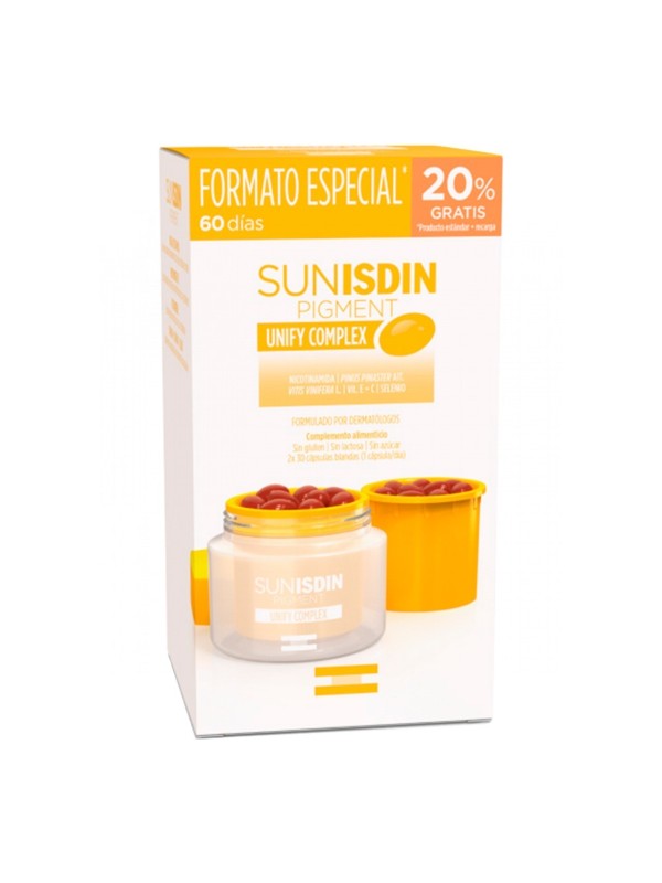 Complemento alimenticio para una protección antioxidante desde el interior. Cuida tu piel frente al daño solar y las manchas gracias a Unify Complex. Con vitaminas C y E, selenio y niacina para proteger las células y mantener la piel en buen estado. Para una piel uniforme y con un tono más claro.