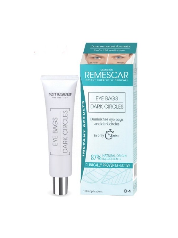 Bolsas y Ojeras de Remescar acaba con las bolsas y ojeras en solo 2 minutos y desde la primera aplicación. El resultado permanece visible hasta 10 horas. Esta nueva fórmula es suave y delicada para la piel. La crema para bolsas y ojeras se puede combinar fácilmente con el maquillaje, sin dejar una sensación desagradable de tirantez. Contiene un 87 % de ingredientes naturales.