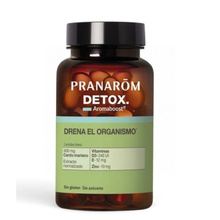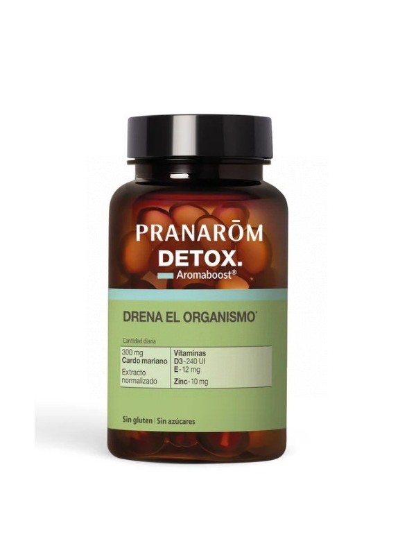 Aromaboost DETOX es un complemento alimenticio diseñado para ayudar a drenar el organismo y favorecer la eliminación de toxinas. Este suplemento, sin riesgo de adicción, promueve el buen drenaje de los órganos de eliminación con una cura recomendada de 1 mes. Las cápsulas Aromaboost DETOX están formuladas con extracto seco estandarizado de cardo mariano, zinc, y vitaminas D3 y E. La fórmula se potencia con una sinergia experta de esencia de limonero y aceites esenciales de enebro y cardamomo, garantizando un 92.8% de ingredientes de origen natural, sin azúcar y sin gluten.