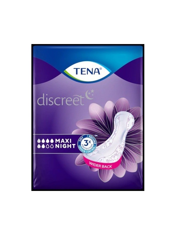 Las compresas para la incontinencia TENA Discreet Maxi Night ofrecen máxima protección a las mujeres, al ser más largas y anchas en la parte trasera, proporcionan mayor cobertura y protección en posición tumbada. Son ideales para las pérdidas de orina moderadas o abundantes, sobre todo por las noches. El máximo nivel de absorción, donde más lo necesitas, aleja la humedad de la piel rápidamente para que te sientas siempre seca, mientras que las microperlas eliminan el mal olor. Gracias a sus suaves laterales elásticos, esta compresa para la incontinencia urinaria se adapta perfectamente al cuerpo. Es muy cómoda, además protege de los escapes y los olores para que te sientas tranquila. Así disfrutarás de una buena noche de descanso.