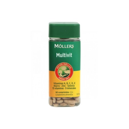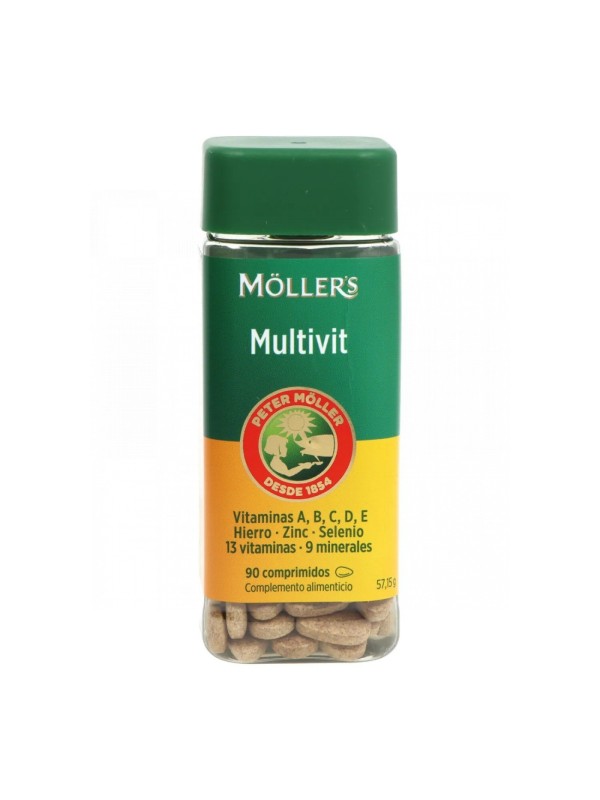 Möller’s multivit es un complemento alimenticio en formato comprimidos, pensado para apoyar la salud y vitalidad en el día a día. Su fórmula combina un amplio espectro de vitaminas y minerales esenciales que contribuyen al normal funcionamiento del sistema inmunitario, a la reducción del cansancio y la fatiga, y al mantenimiento de huesos, piel y visión en buen estado.