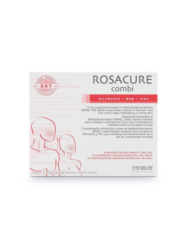 Rosacure Combi es un complemento alimenticio a base de Metilsulfonilmetano(MSM), extracto seco de Cardo Mariano titulado en Silimarina y Zinc que contribuye al mantenimiento de la piel en condiciones normales. Complemento alimenticio con zinc que contribuye al mantenimiento de la piel en condiciones normale