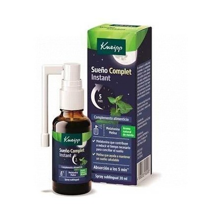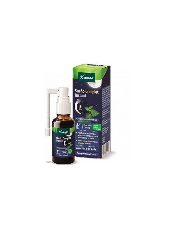 Kneipp® Sueño Complet Instant es un spray sublingual de absorción rápida y combina melatonina, para ayudar a reducir el tiempo necesario para conciliar el sueño, extracto de melisa para mantener un sueño natural y un fresco aroma natural de menta. Al ser formulado sin azúcar, se puede usar Kneipp® Sueño Complet Instant antes de acostarse, sin necesidad de volver a cepillarse los dientes. Gracias a su aplicación sublingual la Melatonina es absorbida a los 5 minutos**. La cánula permite una aplicación fácil y precisa debajo de le lengua.